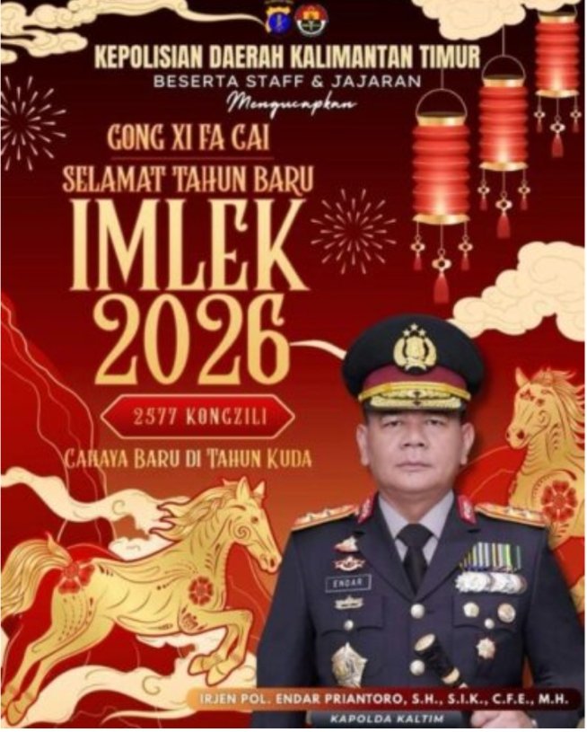 Infotopik.id, Balikpapan – Polda Kalimantan Timur menyampaikan ucapan Selamat Tahun Baru Imlek 2577 Kongzili (Imlek 2026) kepada seluruh masyarakat yang merayakan, khususnya warga Tionghoa di Kalimantan Timur.